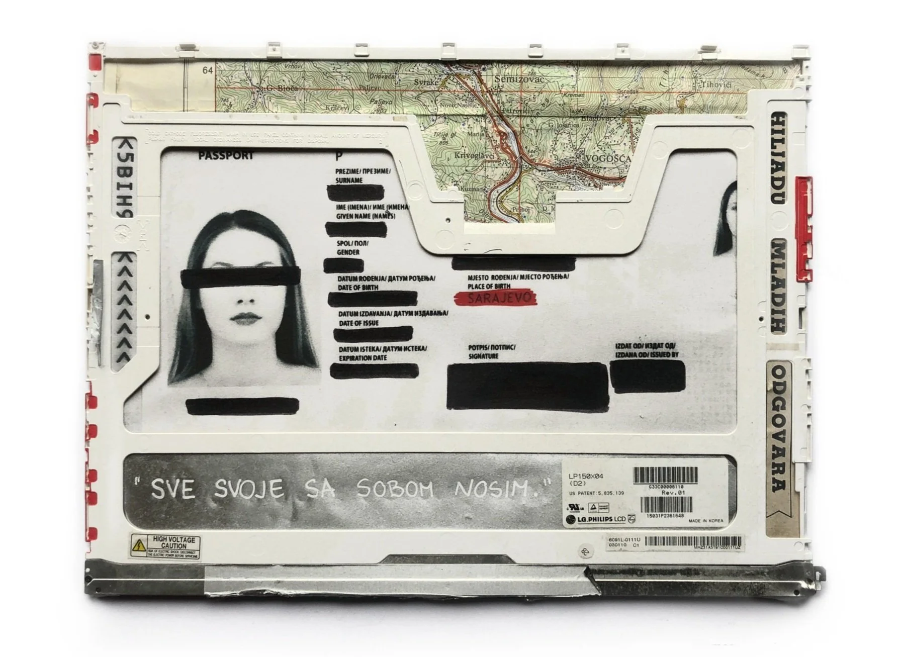 This assemblage, resembling an identification document, explores the theme of youth migration and brain drain from Bosnia and Herzegovina in recent years.